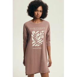 Dámska nočná košeľa v uvoľnenom, pohodlnom strihu, vyrobená z mäkkej a priedušnej sieťoviny, ktorá poskytuje pohodlie a voľnosť pohybu počas spánku. Vďaka dĺžke pred kolená a mierne predĺženému zadnému dielu pôsobí tento model žensky a ľahko. Košeľa má okrúhly výstrih, 3/4 rukávy a jemné rozparky na bokoch, ktoré jej dodávajú ľahkosť a pohodlie. Ozdobná potlač dodáva celku nenápadný charakter. Zabalená v praktickom fóliovom vrecku je ideálnou voľbou pre ženy, ktoré ocenia štýl a pohodlie v domácom dizajne.