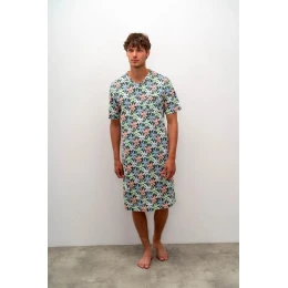 Pohodlná pánská noční košile pro dobrý a zdravý spánek. Noční košile je s krátkým rukávem, náprsní kapsičkou a výstřihem do V a zdobí ji roztomilý potisk palem. Tato noční košile je vyrobena z vysoce kvalitní, genetický nemodifikované řecké jersey bavlny, která poskytuje vysoké pohodlí, příjemný pocit na dotek, prodyšnost, pružnost a odolnost.