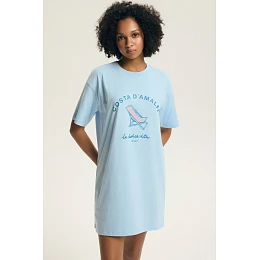 Pohodlná dámska nočná košeľa navrhnutá s ohľadom na pohodlie počas spánku a domáceho odpočinku. Model má klasický okrúhly výstrih a krátke rukávy, ktoré poskytujú voľnosť pohybu a jednoduché nosenie. Košeľa má voľný, pohodlný strih, ktorý neobmedzuje pohyb a je skvelý na relaxáciu. Na prednej strane je módna potlač, ktorá celku dodáva ženský a ležérny charakter. Dĺžka je pred kolená a vďaka polkruhovému lemu je model ľahký a veľmi pohodlný. Nočná košeľa je zabalená v praktickom fóliovom vrecku, ktoré uľahčuje jej skladovanie a prepravu.
