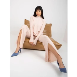 Svetloružové pletené nohavice so širokými nohavicami a rozparkom.