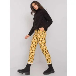 Nohavice z čiernej a žltej vzorovanej látky .