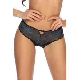 Dámske nohavičky klasického strihu. Predná časť z tmavomodrej čipky, zadná časť zo sieťoviny, nohavičky s čipkovanou páskou.