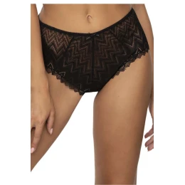 Čierne dámske nohavičky s vysokým pásom Elif sú vyrobené z jemnej čipky s vlnkovým vzorom, ktorá je elegantná a pohodlná. Prednú časť zdobí jemná mašlička a čipkové lemovanie okolo nohavičiek dodáva ľahkosť a jemnosť. Zadná časť je vyrobená z dvojitého tylu. Elastický pás zaručuje pohodlné nosenie a skvelé prispôsobenie sa postave. Sú ideálne na každý deň aj na výnimočné príležitosti, dokonale sa hodia k push-up podprsenke a vytvárajú zmyselný komplet spodnej bielizne.