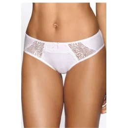Biele klasické nohavičky Iliana. dokonale priliehajúce k postave. orámované bielym lemovaním. vyrobené z bielej hladkej látky na prednej strane s mašličkou uprostred. spodná časť nohavičiek zdobená jemným kvetinovým stehom. zadná strana zakrytá, hladká. bavlnený klin. bavlna 6%Elastan 12%Polyamid 82%