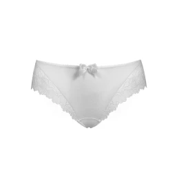 Klasické dámske nohavičky s mierne vykrojeným strihom. Hladká predná časť zdobená jemnou mašličkou. Nohavičky a zadná časť z čipkovanej látky. Bavlnený klin.