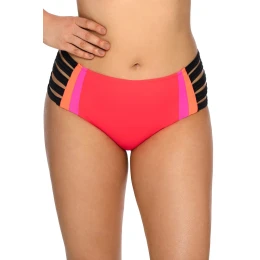 Tento plavkový spodný diel s vysokým pásom a 5 čiernymi pruhmi na bokoch kombinuje intenzívnu korálovú s cukríkovo ružovou a šťavnatou oranžovou, zatiaľ čo kontrastné čierne vložky dodávajú dizajnu charakter.