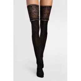 Samodržící 40denní punčochy s krásně zdobenou širokou elastickou podšívkou. Punčochy jsou pokryty vzorem drobných lurexových teček ve zlaté barvě.