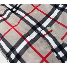 Jedna strana vesty je hladká a druhá je ozdobená károvaným vzorem burberry. Model má volný trapézový střih, stojáček, dvě kapsy bez zapínání a zapíná se zipem. Vesta má délku k bokům. Spodní okraj modelu je půlkulatý a přední část vesty je o něco kratší než zadní.