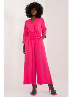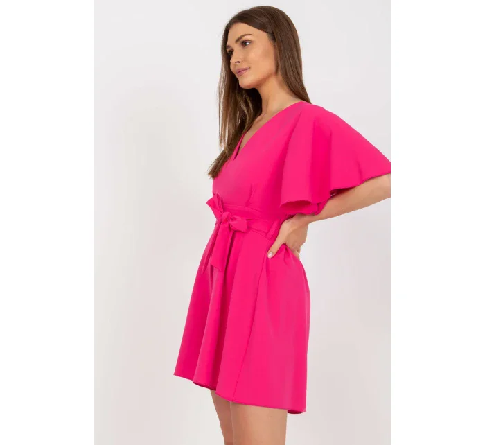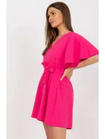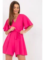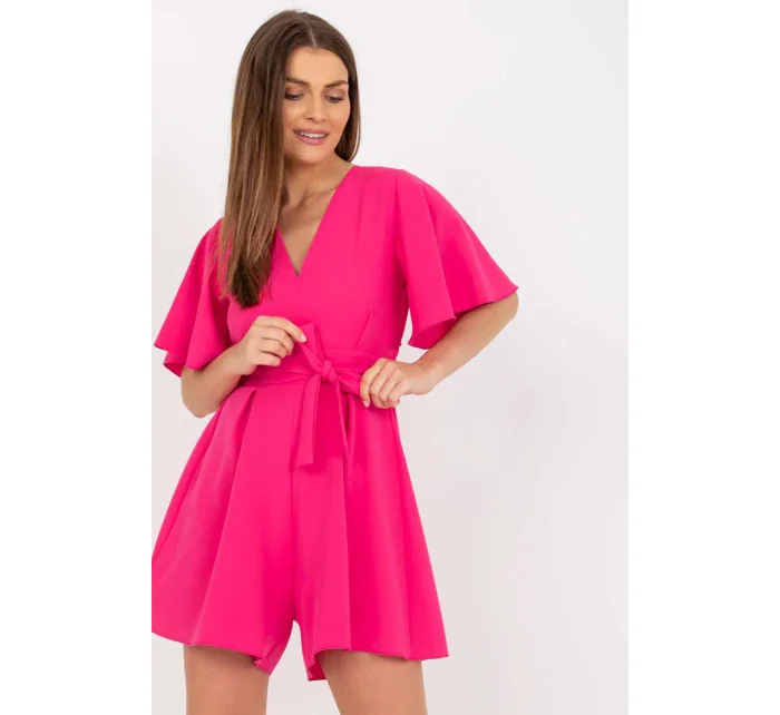 Elegantná kombinéza so širokými krátkymi rukávmi. Výstrih, zaväzovanie v páse, ozdobné riasenie na chrbte, zapínanie za krkom.