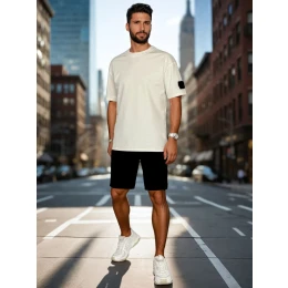 Nowoczesny męski komplet dresowy składający się z koszulki i spodenek cargo. T-shirt z krótkim rękawem i naszywką z guzikami na ramieniu dodaje stylowego akcentu. Spodenki z czterema kieszeniami, elastycznym pasem i naszywką tworzą spójny, miejski look. Miękki materiał zapewnia komfort w wiosennych codziennych stylizacjach.