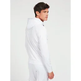 Stylová pánská mikina v bílé barvě na zip s kapucí a logem na přední straně.
