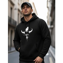 Táto pánska mikina s kapucňou a potlačou lebky býka je model, ktorý kombinuje pohodlný strih s výraznou grafikou inšpirovanou streetwearovým štýlom. Výrazný motív priťahuje pozornosť a dodáva stylingu výrazný, moderný akcent. Vďaka univerzálnemu strihu vyzerá mikina dobre s každodenným oblečením a ľahko sa kombinuje s rôznymi prvkami odevu. Je praktickou voľbou pre mužov, ktorí hľadajú pohodlie a výrazný dizajn v jednom modeli.