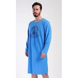 Pánska bavlnená nočná košeľa s dlhým rukávom Jachting. Jednofarebná pánska nočná košeľa s okrúhlym výstrihom a dĺžkou po kolená má na hrudi obrázok plachetnice a nápis "Mys dobrej nádeje". Nočná košeľa je vhodným darčekom pre všetkých milovníkov mora a diaľok. Použitý materiál zo 100 % bavlny je príjemný a pružný na dotyk.