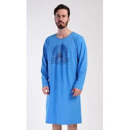 Pánská bavlněná noční košile s dlouhým rukávem Jachting. Jednobarevná pánská noční košile s kulatým výstřihem a délkou po kolena má na hrudi obrázek plachetnice a nápis 'Cape of good hope'. Noční košile je vhodným dárkem pro všechny milovníky moře a dálek. Použitý materiál s obsahem bavlny 100% je příjemný a poddajný na dotek.