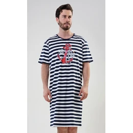 Pánská noční košile s krátkým rukávem Kotva. Pánská noční košile pro všechny milovníky pohodlí s pruhovaným podkladem má na hrudi velikou kotvu. Použitý materál je jemný a poddajný na dotek.