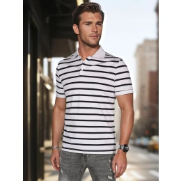 Koszulka polo męska o ponadczasowym fasonie, wykonana z miękkiego i przewiewnego materiału, który doskonale sprawdza się w cieplejsze dni. Klasyczny krój zapewnia komfort noszenia, a poziome paski i zapięcie na guziki dodają całości nowoczesnego stylu. Koszulka idealna na co dzień oraz do miejskich stylizacji. Świetna na sezon wiosenny.