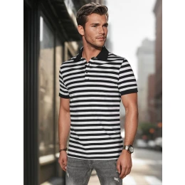 Koszulka polo męska w paski to klasyczny model z nowoczesnym twistem. Wykonana z miękkiego, przyjemnego w dotyku materiału, gwarantuje komfort noszenia przez cały dzień. Posiada zapięcie na guziki i dopasowany, ale swobodny krój, który świetnie układa się na sylwetce. Idealna na co dzień, jak i półformalne okazje w cieplejsze dni sezonu wiosennego oraz letniego.