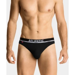 Čierne pánske slipy sú v páse označené širokou a mäkkou gumičkou s nápisom ATLANTIC. Slipy majú športovú estetiku - vysoko vykrojené boky a nízky pás zakončený spomínanou vonkajšou gumičkou. Mäkká, na dotyk príjemná gumička netlačí na telo ani sa naň nelepí, takže nespôsobuje nepohodlie. slipy sú vyrobené z úpletu, ktorý je kombináciou bambusu, jemného ako hodváb, príjemnej bavlny a elastanu. Tento úplet je šetrný k pokožke a má termoregulačné vlastnosti - v horúčavách poskytuje pocit chladu a v zime tepla. Je odolný pri používaní a svoje vlastnosti si zachováva dlhý čas.