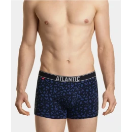 W trzypacku znajdziesz obcisłe bokserki męskie w kolorach: niebieskim - 2 pary (pokryte granatowym abstrakcyjnym wzorem) oraz granatowe (gładkie). Bokserki o sportowym charakterze mają niski stan i uniwersalnej długości nogawki. W talii zaznaczone są miękką i nieuciskającą ciała gumą ozdobioną logo ATLANTIC. Bokserki mają także profilujące cięcia, które sprawiają, że bielizna perfekcyjnie dopasowuje się do ciała i do niego przylega. Aby wykonać bokserki sięgnęliśmy po miłą w dotyku dzianinę zwaną „cotton stretch”, która jest kombinacją delikatnej bawełny oraz rozciągliwego elastanu. Nasza dzianina jest trwała w użytkowaniu, przepuszcza powietrze, zapobiega poceniu się ciała, i jest przyjazna dla najbardziej wrażliwej dla skóry.