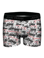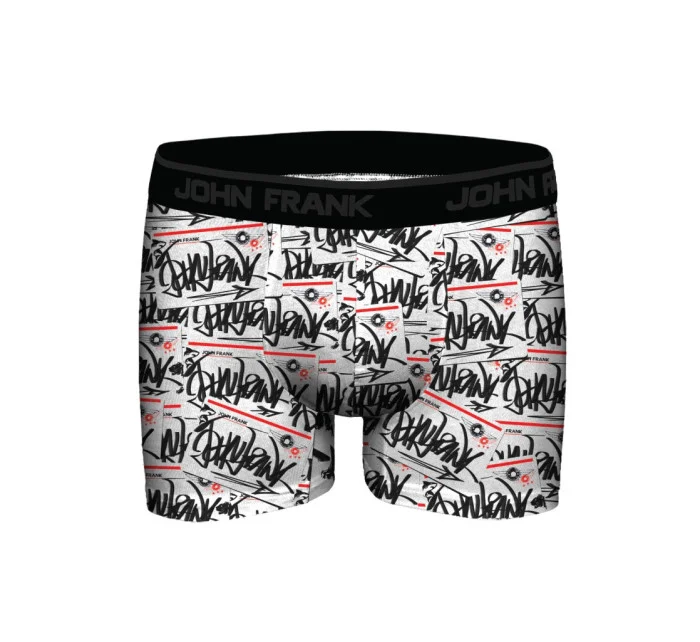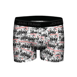 Pánske boxerky John Frank vyrobené z vysokého podielu mikromodalu. Boxerky sú veľmi príjemné na dotyk a pohodlné na nosenie. Boxerky majú čierny vzor graffiti na bielom pozadí. Elastický pás má po obvode logo John Frank.