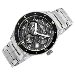 Adriatica A8322.5126QF to zegarek dla mężczyzny, który ceni funkcjonalność podaną w solidnej formie. Tarcza z włókna węglowego w głębokim odcieniu antracytu przyciąga wzrok surowym, technicznym stylem. Jasne indeksy i cyfry arabskie doskonale kontrastują z tłem, zapewniając natychmiastowy odczyt, a potężne wskazówki z luminescencyjnym wypełnieniem nie zawodzą nawet po zmroku. Zegarek wyposażono w trzy praktyczne chronografy – dzień tygodnia, czas 24-godzinny i licznik sekund – rozmieszczone tak, by nie zaburzać czytelności i harmonii tarczy. Całość dopełnia datownik oraz obracany bezel z precyzyjną skalą minutową – funkcjonalny i gotowy do działania. Wewnątrz pracuje niezawodny, szwajcarski mechanizm kwarcowy Ronda X30 Swiss Made, znany z wytrzymałości i dokładności. Zegarek chroniony jest przez szkło mineralne z powłoką antyrefleksyjną, które redukuje odbicia i zwiększa odporność na codzienne zarysowania.