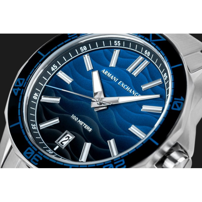 Zegarek męski Armani Exchange Spencer AX1950 to model, który łączy nowoczesny styl z dobrą funkcjonalnością: koperta ze stali nierdzewnej o średnicy około 44 mm, mineralne szkło chroniące tarczę, solidna stalowa bransoleta szerokości około 22 mm oraz mechanizm kwarcowy gwarantujący precyzyjne odmierzanie czasu. Na niebieskiej tarczy z motywem „fali” widoczny jest datownik, co podnosi użyteczność zegarka. Model posiada wodoszczelność na poziomie 100 metrów (10 ATM), co pozwala na swobodne użytkowanie w warunkach codziennych i przy kontakcie z wodą. Stylowy, wyrazisty design czyni go idealnym wyborem dla mężczyzny szukającego zegarka, który sprawdzi się zarówno do codziennego stroju, jak i bardziej eleganckich okazji.