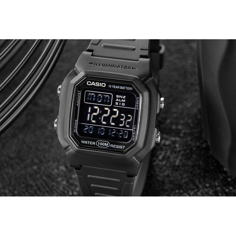 Zegarek Męski Casio W-800H to niezawodność w czytelniej formie - nowoczesny zegarek cyfrowy z dużym wyświetlaczem, który umożliwia szybki i łatwy odczyt godziny. Wyposażony w wodoszczelność do 100 metrów, baterię o żywotności 10 lat, podświetlenie LED oraz inne funkcje. Zegarek oferuje wszystkie najważniejsze informacje - godzina, data i dzień tygodnia - w dużej czytelnej formie. Dzięki funkcjom takim jak stoper 1/100 sekundy, podwójny czas i alarm z drzemką, świetnie sprawdza się zarówno podczas treningów, jak i w podróży. Wytrzymałe podświetlenie LED z efektem poświaty zapewnia dobrą widoczność nawet po zmroku. Solidna konstrukcja zapewnia trwałość w miejskiej dżungli i podczas outdoorowych przygód.