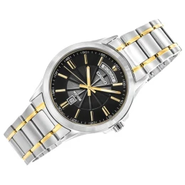 Jego trójwymiarowa czarna tarcza ozdobiona precyzyjnymi i indeksami i eleganckimi wskazówkami emanuje wyrazistą klasą, która przyciąga spojrzenia i podkreśla charakter noszącego. Na tarczy znajduje się okienko z dniem tygodnia, który wyświetlany jest w języku angielskim, co dodaje mu międzynarodowego charakteru i stylu. Poniżej znajduje się również oddzielne okienko z aktualną datą.