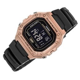 Casio W-218HM-5BVDF to esencja klasycznego stylu Casio w nowoczesnym, sportowym wydaniu: wyrazisty, prostokątny wyświetlacz LCD w solidnej kopercie, czytelny na pierwszy rzut oka, z subtelnymi akcentami, które dodają mu świeżości i uniwersalności. Zegarek został stworzony do codziennego tempa: wodoszczelność 50 m, podświetlenie LED dla pewnego odczytu po zmroku, 7-letnia bateria dla długiej niezawodności, a także praktyczny zestaw funkcji – stoper 1/100 s (do 60 min), alarm dzienny i sygnał pełnej godziny, automatyczny kalendarz oraz format 12/24 h. Lekki i wygodny, zszkiełkiem z tworzywa (Resin Glass) i wytrzymałym paskiem z żywicy, świetnie sprawdzi się zarówno na treningu, jak i w codziennych stylizacjach. Jeśli szukasz bezkompromisowej prostoty połączonej z legendarną trwałością Casio, W-218HM-7AVDF będzie strzałem w dziesiątkę.