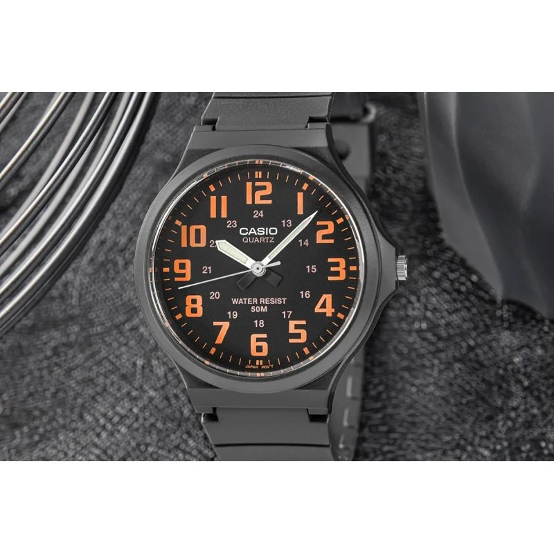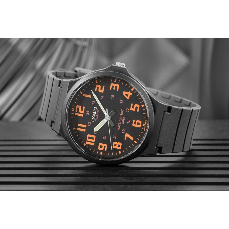 Pánsky model hodiniek CASIO MW-240 spája minimalizmus, funkčnosť a pohodlie v mužnom dizajne. Vďaka ľahkej konštrukcii hodiniek (len 35 g!) sú na zápästí takmer nepostrehnuteľné. Pružný matný remienok zo živice sa prispôsobí pohybom, je odolný voči opotrebovaniu a pripravený na každú situáciu - od stretnutí až po tréning. Veľké, ľahko čitateľné číslice a kontrastné ručičky s fluorescenčnou povrchovou úpravou vám umožnia skontrolovať čas na prvý pohľad bez ohľadu na svetelné podmienky. Odolné živicové sklíčko zaručuje odolnosť pri každodennom používaní a vodotesnosť 5 BAR zaručuje, že postriekanie, dážď ani rýchla sprcha nebudú problémom.