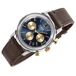 Projekt zegarka czerpie ze stylistyki lat 60., a jego tarcza przypomina klasyczny kokpit samochodowy – pełen charakteru i eleganckich detali. Granatowe tło z wykończeniem sunray efektownie odbija światło, a zagłębione złote subtarcze tworzą wyrazisty, ale wciąż harmonijny kontrast. Wyjątkowe indeksy na godzinach 3, 9 i 12 nadają tarczy równowagę i rytm, a ich kształt i połysk nie tylko przyciągają wzrok, ale też podkreślają retro klimat tego modelu.