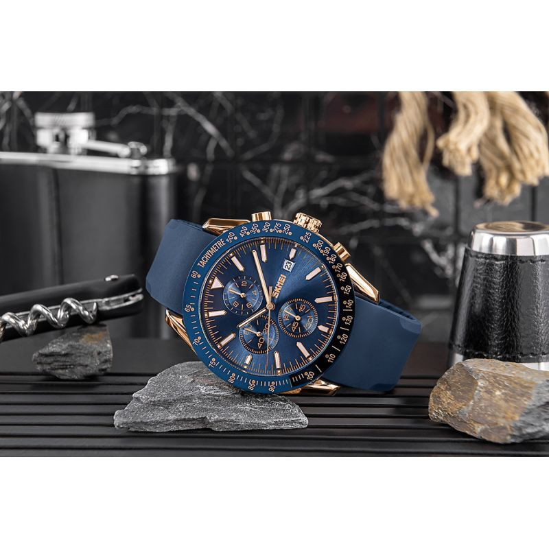 Zegarek Skmei 9253 w wersji z silikonowym paskiem prezentuje kolorystykę inspirowaną ekskluzywnymi czasomierzami premium, która dodaje mu wyjątkowego, dynamicznego charakteru. Miedziana koperta kontrastuje z głębokim, wyrazistym granatowym metalicznym bezlem i tarczą, tworząc luksusowy, sportowy wygląd, nawiązujący do stylu najlepszych światowych marek. Silikonowy pasek zapewnia dodatkowy komfort i lekkość, idealnie łącząc elegancję z funkcjonalnością, która sprawdzi się w każdej sytuacji.