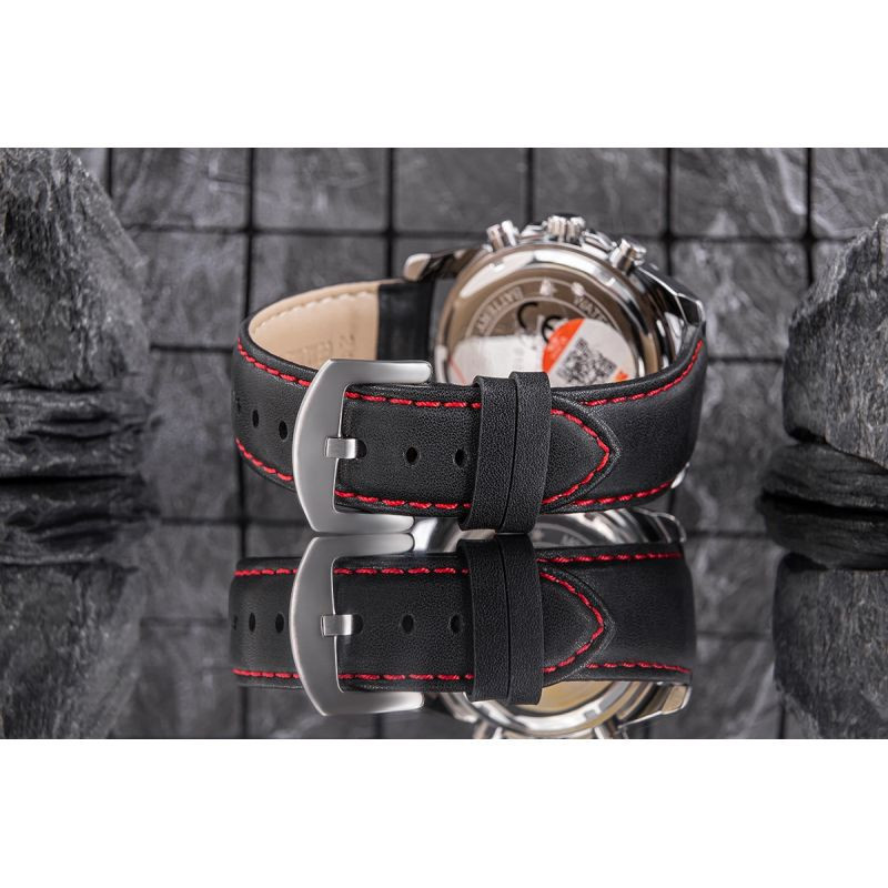 Idealny towarzysz każdego mężczyzny, który chce wyglądać dobrze, działać precyzyjnie i być zawsze gotowy na działanie. Trójwymiarowa tarcza, precyzyjne wskazówki i sportowy czerwony sekundnik tworzą niepowtarzalny design, który przyciąga wzrok. Funkcje chronografu i solidny skórzany pasek sprawiają, że to nie tylko stylowy dodatek, ale również niezawodne narzędzie do zarządzania czasem.