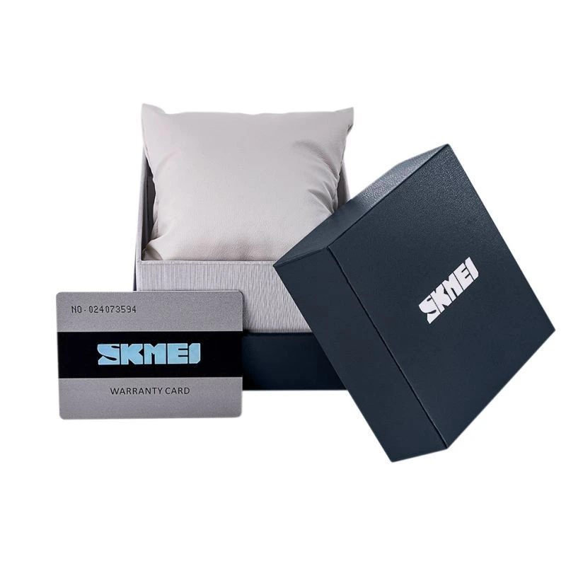 Do każdego zegarka marki Skmei dołączamy stylowe pudełko, które jest idealnym uzupełnieniem zestawu. Granatowe pudełko z subtelnym logo Skmei nie tylko chroni czasomierz, ale także dodaje mu wyjątkowego charakteru. Wnętrze pudełka wyściełane jest miękką poduszką, która bezpiecznie podtrzymuje zegarek, podkreślając jego detale i zapewniając mu elegancką prezentację.