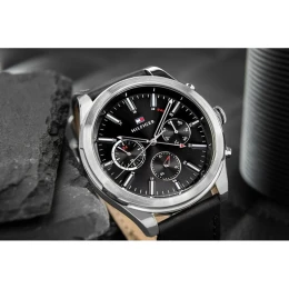 Srebrna koperta otacza głęboką, czarną tarczę, gdzie kontrastujące biało-czarne indeksy nadają zegarkowi wyrazistości i nowoczesnego charakteru. Srebrne wskazówki oraz sekundnik z odważnym, czerwonym akcentem wprowadzają dynamiczny pazur, a czarny skórzany pasek idealnie dopełnia całości, tworząc dodatek, który pasuje zarówno do garnituru, jak i casualowego looku. Subtelne czerwone akcenty na subtarczu chronografu nadają zegarkowi Tommy Hilfiger Ashton dynamicznego, sportowego charakteru. Te detale przyciągają uwagę, podkreślając wyjątkowy design i precyzję wykonania.