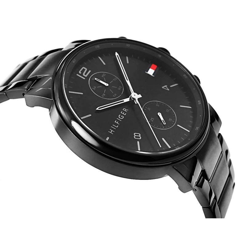 Pohodlný oceľový náramok je dokonalým doplnkom týchto hodiniek. Veľké články a zacvakávacia spona sú zárukou pevnosti a pohodlia pri každodennom používaní. Komfort dotvára hrúbka náramku, ktorý sa pohodlne prispôsobí mužskému zápästiu. Spona je podpísaná logom značky Tommy Hilfiger, čo hodinkám dodáva na prestíži a zaručuje jedinečnosť medzi ostatnými hodinkami značky.
