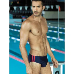 Pánské plavky slipového střihu, na gumu v pase. Na bocích jinobarevné proužky.