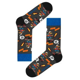Pánske vyššie ponožky JOHN FRANK s originálnym motívom. Ponožky sú pohodlné, neťahajú, sú priedušné a v hornej časti sú ukončené neťahajúcim lemom. Ponožky sú univerzálne vo veľkosti od 40 do 45. Materiálové zloženie: 80 % bavlna, 17 % polyamid a 3 % elastan.