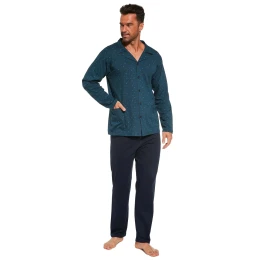 Pánske pyžamo 114/64 plus CORNETTE - vyrobené z kvalitnej bavlny - tmavomodré vzorované tričko s dlhými rukávmi a vreckami - zapínanie na gombíky - pohodlné jednofarebné dlhé nohavice Zloženie materiálu: 100% bavlna
