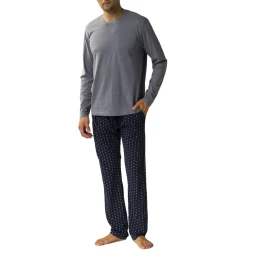 Pánske pyžamo 373 Atlantic - vyrobené z kvalitnej bavlny - sivé tričko s dlhými rukávmi - vrecko na prednej strane - dlhé modré vzorované nohavice s vreckami - nastaviteľná šnúrka v páse