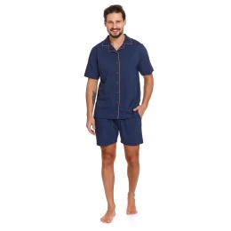 Pánske pyžamo 4261 Doctornap - vyrobené z kvalitnej bavlny - tmavomodré tričko s krátkymi rukávmi - zapínanie na gombíky po celej dĺžke - modré šortky s vreckami - zlaté lemovanie - hypoalergénne - vhodné pre alergikov a osoby trpiace podráždením pokožky - certifikát OEKO-TEX Standard 100
