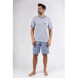 Pánske pyžamo s krátkymi rukávmi, výstrihom s jemnou potlačou na prednej strane a krátkymi kockovanými šortkami.
