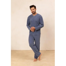 Pánske pyžamo Regina 490 BIG J/25 je klasickou zimnou ponukou vyrobenou výlučne z vysokokvalitnej froté bavlny. Tričko s dlhými rukávmi má posádkový výstrih a módny pruhovaný vzor, ktorý súprave dodáva mierne športový, moderný charakter. Súpravu dopĺňajú dlhé, rovno strihané jednotné nohavice - pohodlné a prispôsobené na každodenné nosenie. Mäkký froté úplet poskytuje teplo a pohodlie, vďaka čomu je táto súprava ideálnou voľbou na chladnejšie večery a zimné noci.