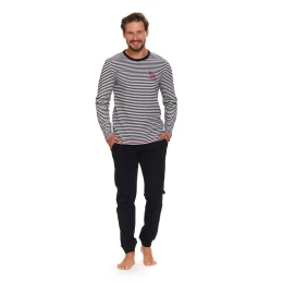 Pánské pyžamo 5234 plus Doctornap - vyrobené z velmi kvalitní a příjemné bavlny - černo-bílé pruhované tričko s dlouhými rukávy - na přední straně ozdobené potiskem - dlouhé tmavé kalhoty s kapsami - certifikát OEKO-TEX Standard 100
