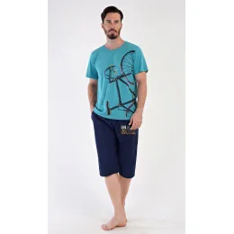 Pánske bavlnené bermudy pyžamo Dominik. Pánske pyžamo sa skladá z trička s krátkym rukávom a nohavíc s dĺžkou po kolená. Jednofarebné tričko zdobí výrazný obrázok bicykla. Nohavice majú elastický pás, šnúrku na stiahnutie a praktické vrecká. Použitý materiál je mäkký a príjemný na dotyk. Obsah bavlny v tričku a nohaviciach je 100 %.