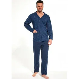 Pánske rozopínacie pyžamo od značky Cornette, ktoré je vyrobené z veľmi kvalitnej bavlny. Vzorovaný vrchný diel pyžama má golier, vrecká a zapína sa gombíkmi. Komplet dopĺňajú dlhé jednofarebné nohavice bez úpletov.