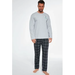 Pohodlné bavlněné pánské pyžamo s dlouhým rukávem a kalhoty od značky Cornette. Vrchní díl má na přední straně potisk a má kulatý výstřih. Pyžamo má dlouhé kalhoty s kostkovaným vzorem a jsou bez úpletů. Materiálové složení: 100% bavlna