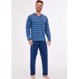 Pohodlné pánské pyžamo s dlouhým rukávem a dlouhými kalhotami. Vrchní část pyžama je vyrobena z měkkého materiálu s horizontálními pruhy a má výstřih ve tvaru „V“, zakončený jemným lemováním. Součástí setu jsou dlouhé hladké kalhoty vyrobené z kvalitní bavlny v tmavě modré barvě. Volný střih pyžama zajišťuje maximální pohodlí a svobodu pohybu během spánku.
