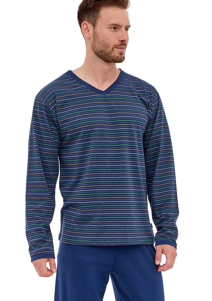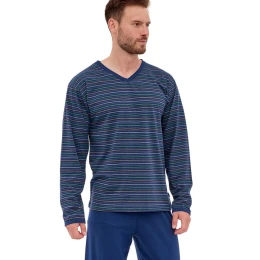 Pohodlné bavlněné pánské pyžamo s dlouhým rukávem a kalhoty od značky Cornette. Vrchní díl má na obou stranách potisk a má výstřih do V. Pyžamo má dlouhé kalhoty, bez úpletů. V pase je všitá pohodlná guma.