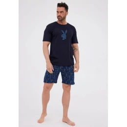 Pánske pyžamo pozostáva z trička s krátkymi rukávmi a okrúhlym výstrihom a krátkych šortiek. Tričko je tmavomodré a potlačené ikonickým logom králika Playboy. Vzdušné šortky sú vzorované opakujúcim sa motívom králika.
